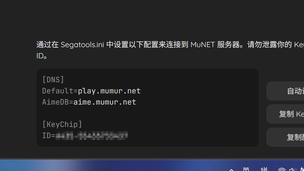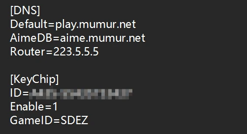 有了狗号下一步就是打开你的segatools.ini修改狗号,注意服务器地址也要改成对应的,当然如果你不知道怎么改的话也可以直接照着我的填(前提是你和我一样使用的是munet服),只需要将ID修改为自己的即可