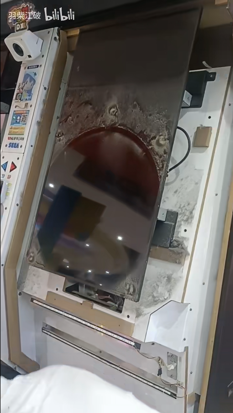 有很多玩家会不理解,以为舞萌是上下两块屏幕组成的,但其实是有两块43寸竖直摆放的屏幕组成的,如图↑(by BV1kt4y1h7QW),具体这个屏幕是哪家的我也没查到具体的信息